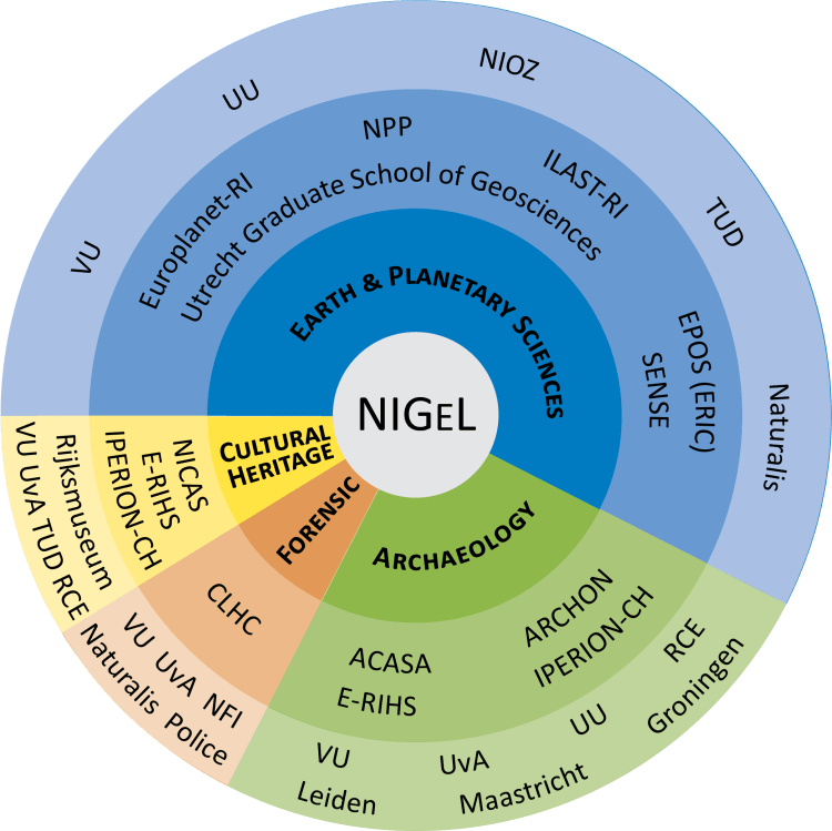 NIGeL users are summarized in the figure on the left. The inner circle represents the expected usage per discipline. The middle circle the multi-national and multi-disciplinary research infrastructures and institutes and research schools making use of NIGeL. The outer circle lists the major user institutes.
